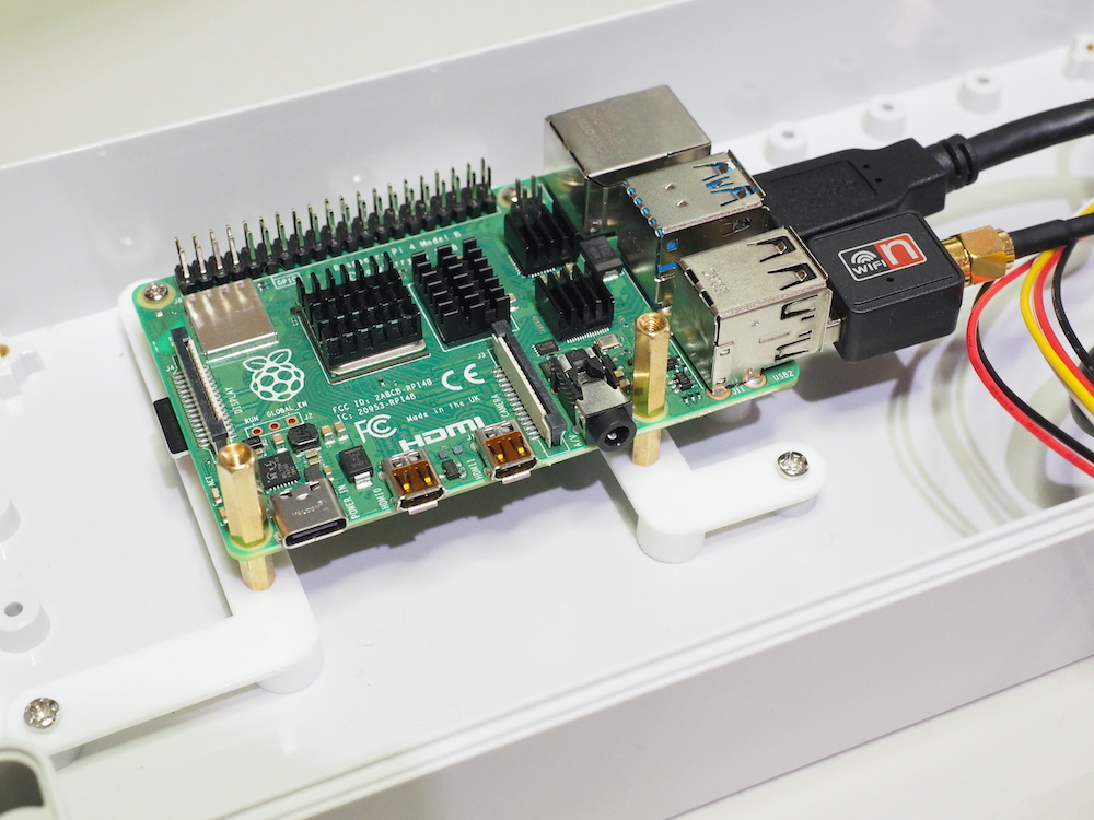 The Raspberry Pi goes on the standoffs. Fix the upper standoffs with the M2.5 screws and the lower ones with two 16mm hex standoffs.