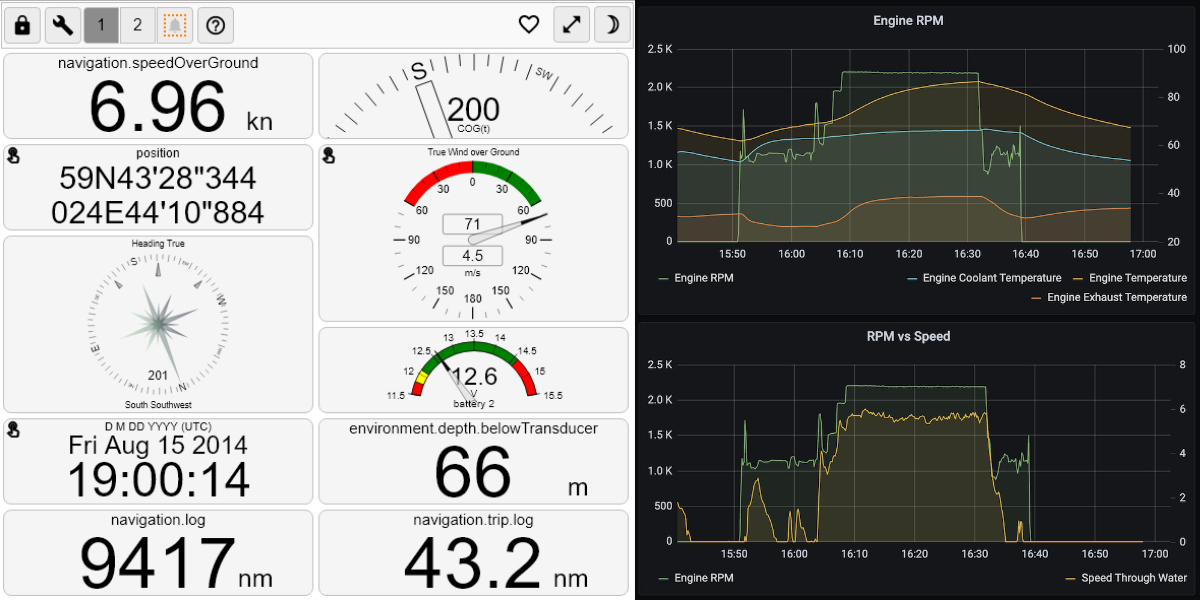 The included software will log all essential NMEA 2000 traffic on the boat and allows you to visualize the real-time and historical behavior of different values using integrated instrument panels as well as Grafana dashboards.