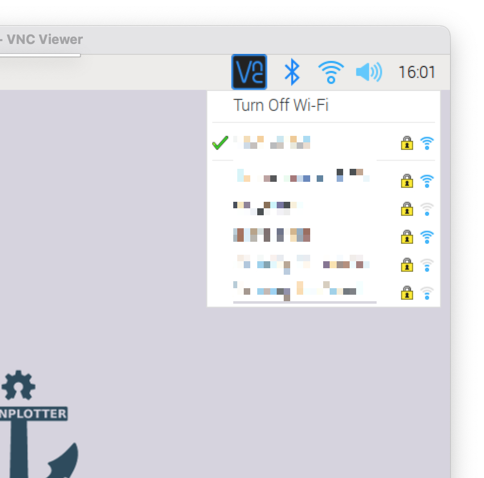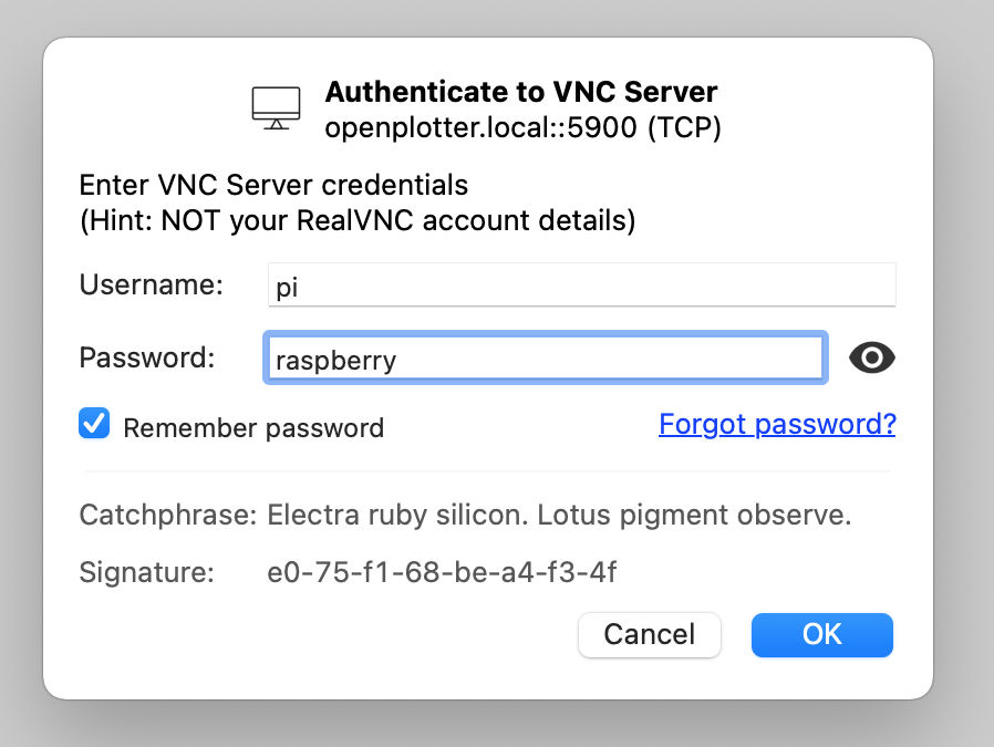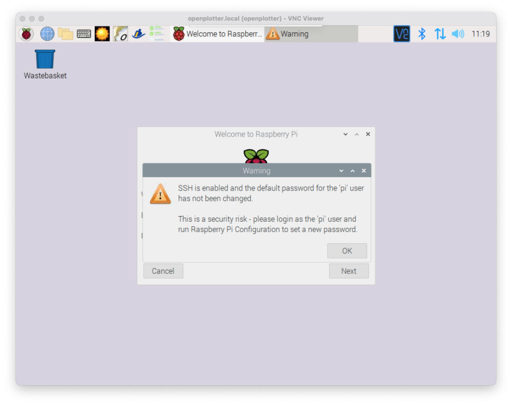 Anyway. Get back to VNC Viewer and connect to `openplotter.local`. You changed the `pi` user password during the initial configuration, so you'll need to enter the new password in VNC Viewer.