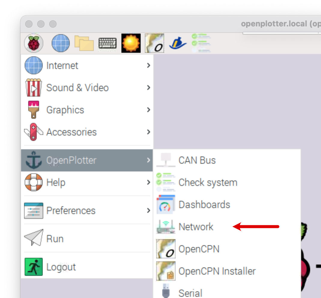 Once you're back in, we'll modify the network settings on the OpenPlotter installation. From the Raspberry menu, select OpenPlotter -> Network.