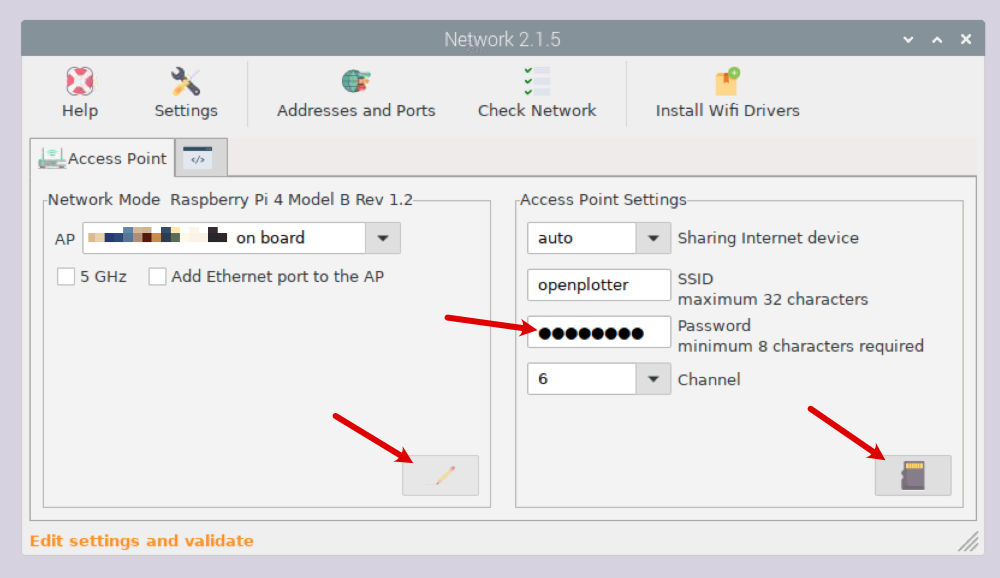 In the network panel, you'll see the available network devices on the left and the access point settings on the right.