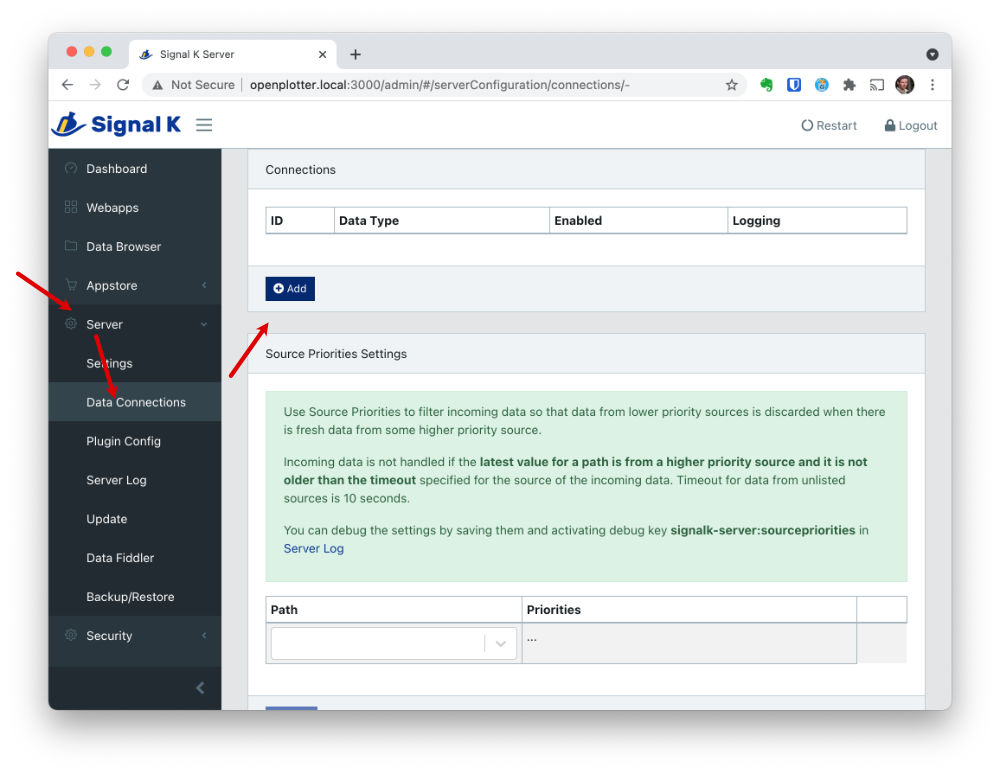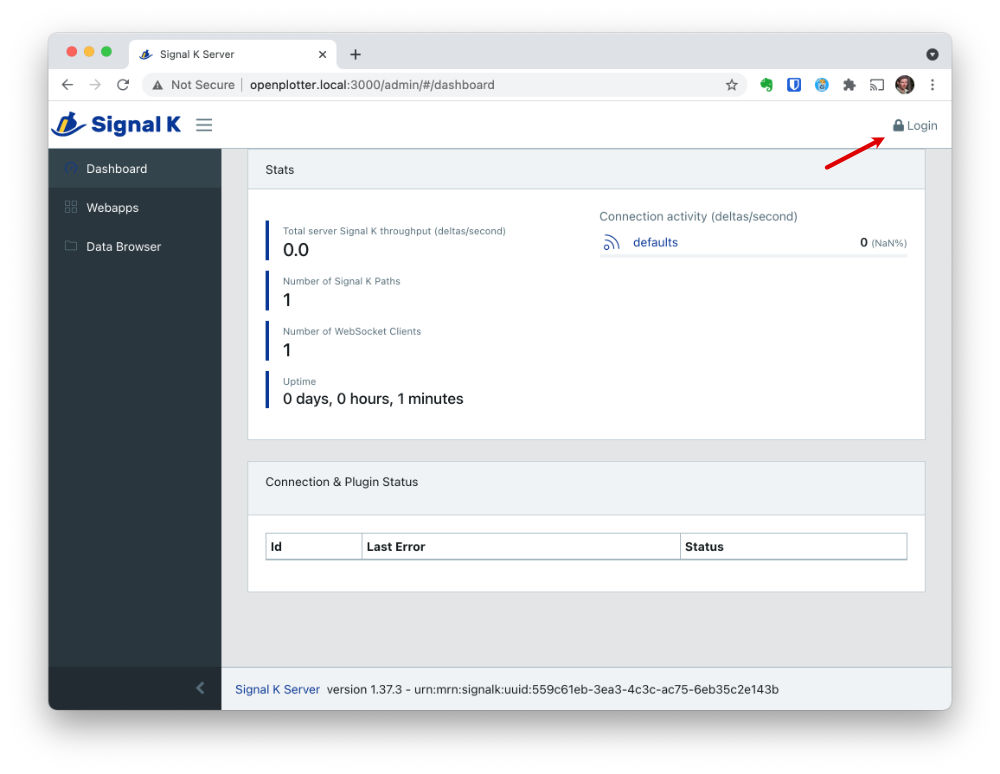 To process the NMEA 2000 data, we need to configure Signal K to receive it. Open the Signal K dashboard at [http://openplotter.local:3000/](http://openplotter.local:3000/).