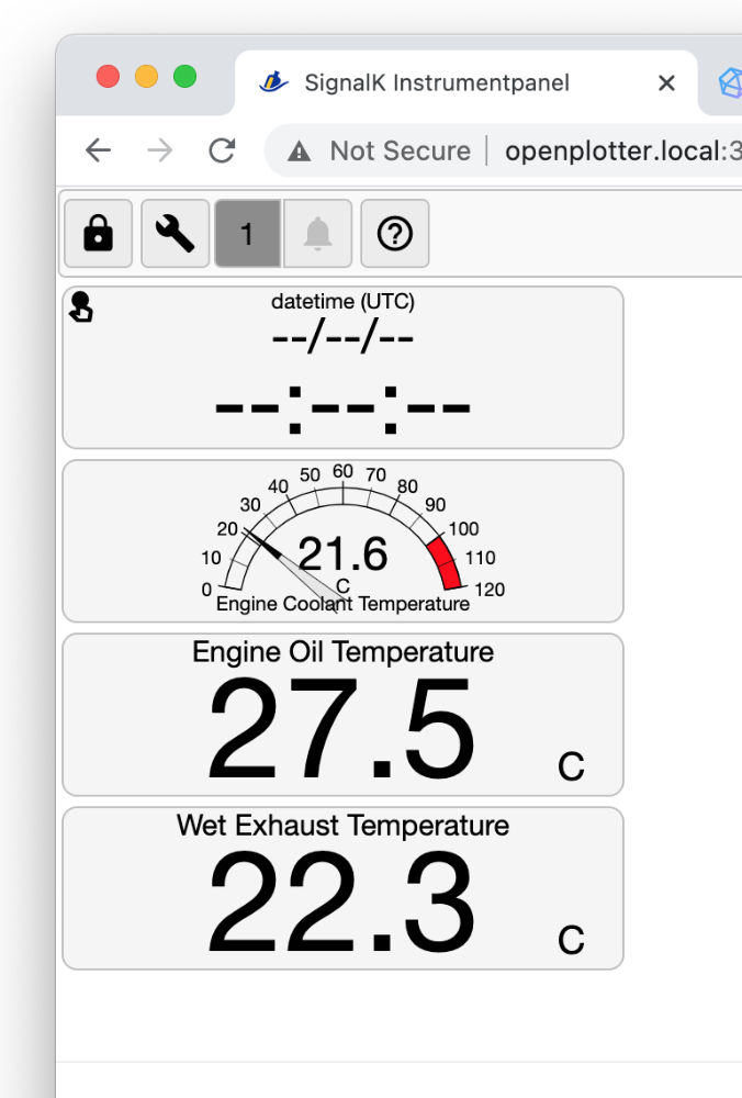 My test lab is just under a metal roof with absolutely now GPS reception, and the only interesting data in my network is coming from the [1-Wire Temperature Sensor](https://docs.hatlabs.fi/sh-esp32/pages/tutorials/onewire-temperature/). So, my instrument panel now consists of three temperature values: