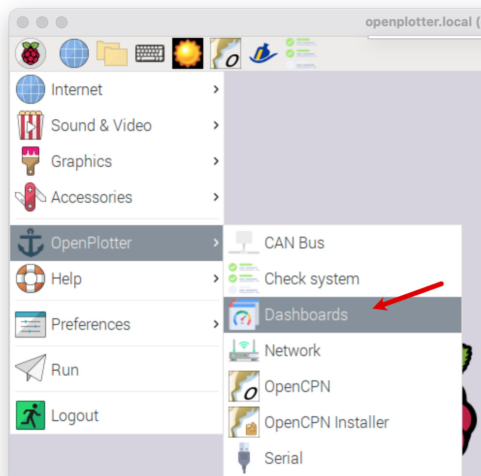To install InfluxDB and Grafana, go back to VNC Viewer and open OpenPlotter -> Dashboards from the Raspberry menu: