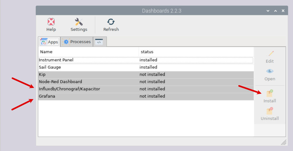 Select InfluxDB and click Install. It'll take a while but once it's finished, go back to the Apps tab and select Grafana and click Install. That's it.