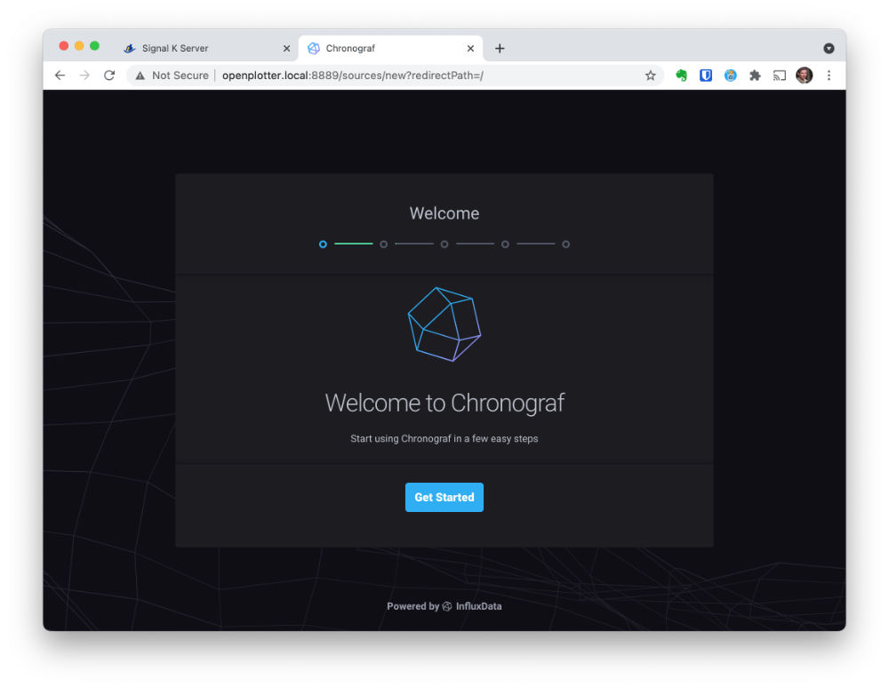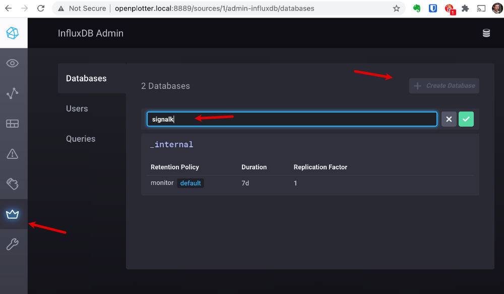 Then we'll have to create a new database in InfluxDB. Open Chronograf, an InfluxDB web UI in your browser: [http://openplotter.local:8889/](http://openplotter.local:8889/).