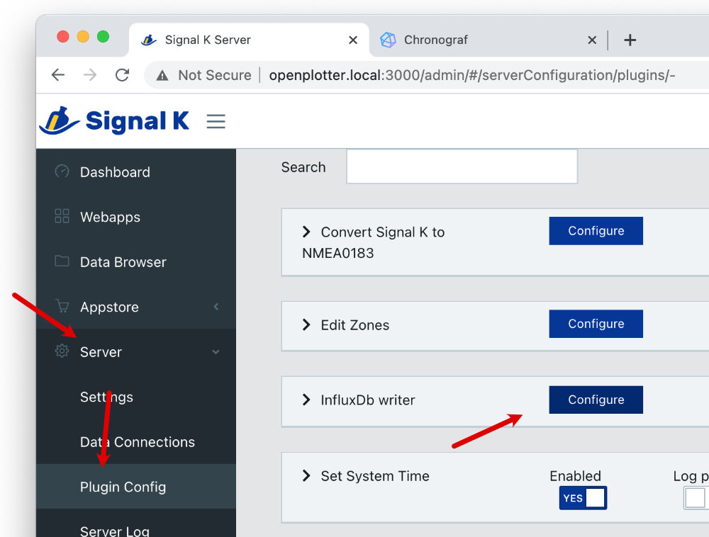 Now that we have the database waiting for us, let's feed some data to it. Go back to the Signal K dashboard to configure the InfluxDB writer plugin: