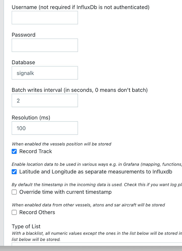 Leave the username and password empty. Our database was `signalk`. If you want, modify the batch write interval and data resolution. The interval is 10 seconds by default, but if you want a bit more real-time display of data, enter 2. Resolution dictates how often a single measurement is written to the DB. The default of 200 ms is probably fine but I wanted even more and chose 100 ms. Also select the checkboxes as shown below.