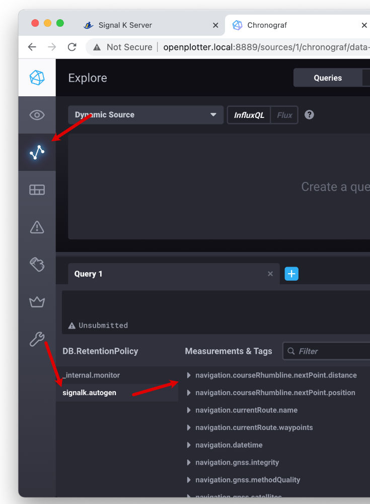 Scroll down and click Submit to apply the configuration. At this point, we should have measurements flowing into the database. Let's verify that. Go back to Chronograf, select the Explore view. You should have a source called `signalk.autogen` at the bottom. Select that, and individual measurement names should appear. Great.