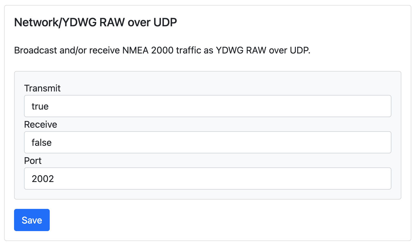 It allows you to enable or disable receiving and transmitting YDWG RAW data as well as setting a port number for the UDP socket.